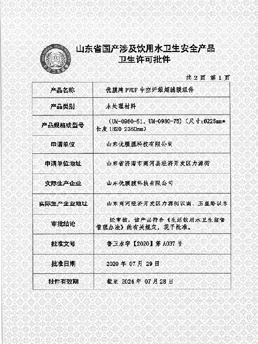 2020年7月29日,優膜牌PVDF中空纖維超濾膜組件獲批“山東省國產涉及飲用水衛生安全產品衛生許可批件”證書,產品符合國家規范和標準。山東